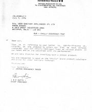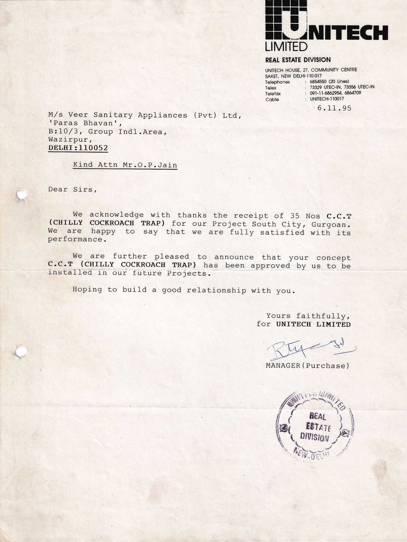 We acknowledge with thanks the receipt of 2 Nos of C.C.T. (chilly cockroach Trap) as samples. We further say that we are fully satisfied with its functional performance and pleased to state that this has been approved by us to be installed in our future various project works. We are also looking forward for the other sanitary appliances & fittings of your company as sanitary installation in our works.